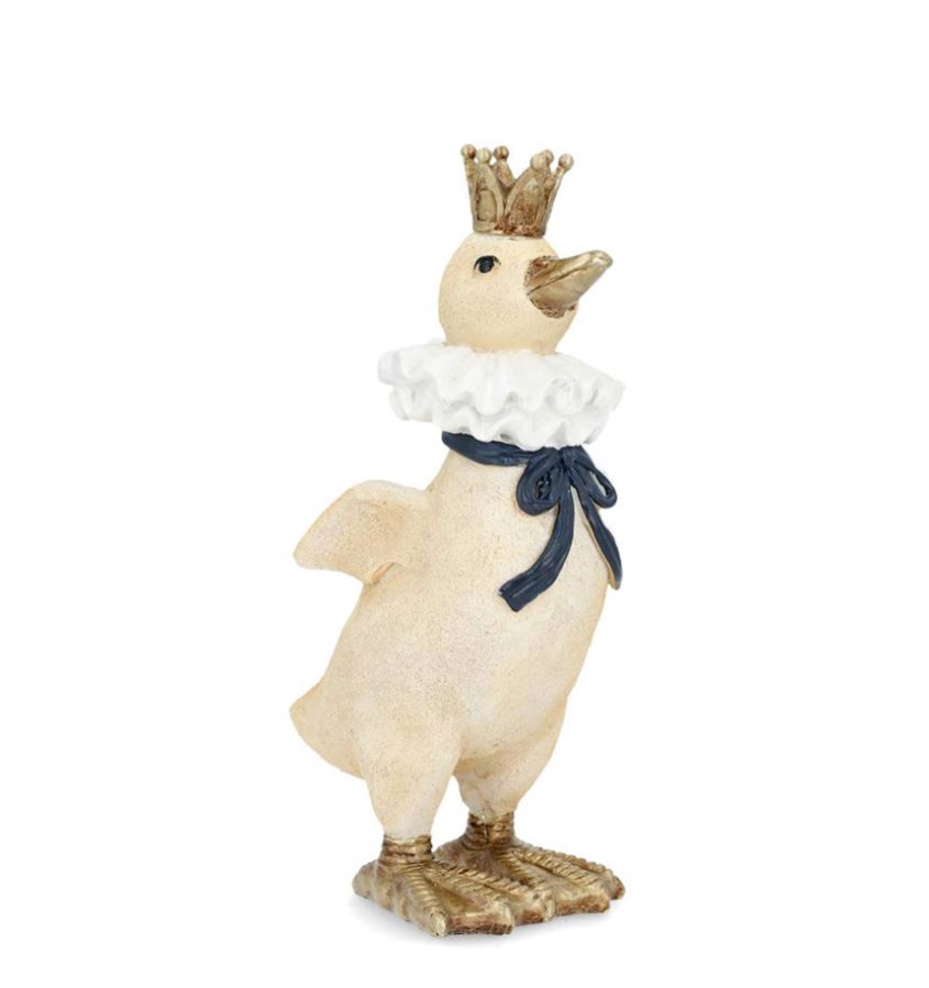 Få en flot dekoration til vinduet eller sofabordet med en andunge med krave om halsen og krone på hovedet. Fremstillet i poly.