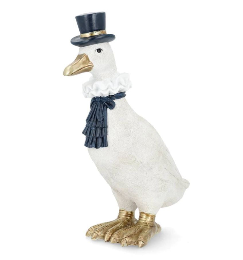 Få en fin dekoration til vinduet eller sofabordet med en and i hat og krave. Fremstillet i poly.