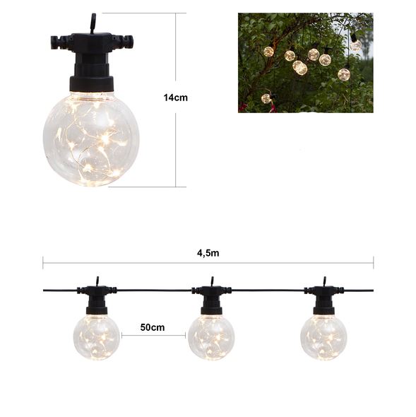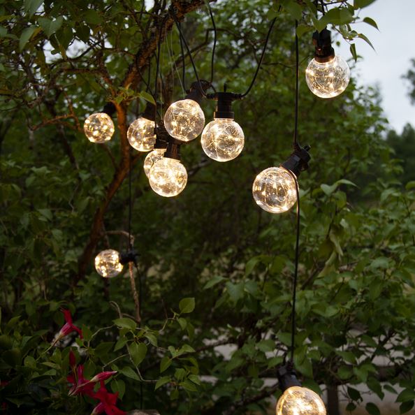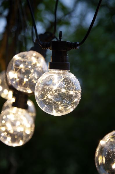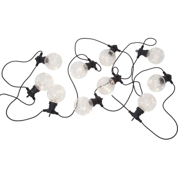 Smart partyslynge til dekoration både til hverdag og fest. Skaber et dejligt lys i mørket. 10 klare kugler med 10 varm-hvide LED i hver kugle.