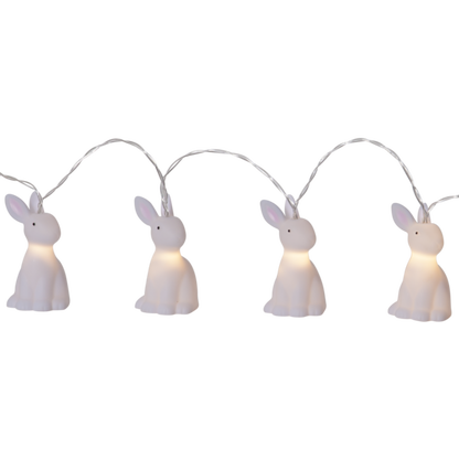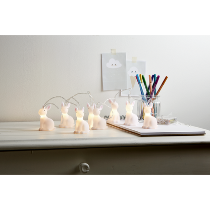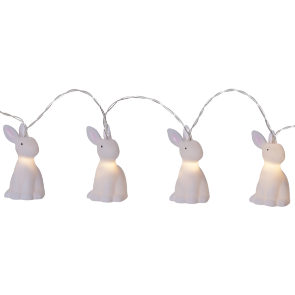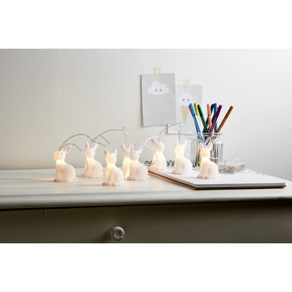 Sød sløjfe med 10 kaniner tændt i LED-lys. Dejligt at have i børneværelset. Den indbyggede timer gør det let at indstille, hvornår lyssløjfen skal lyse. Betjenes med 3 stk. AA-batterier. Batterier medfølger ikke.