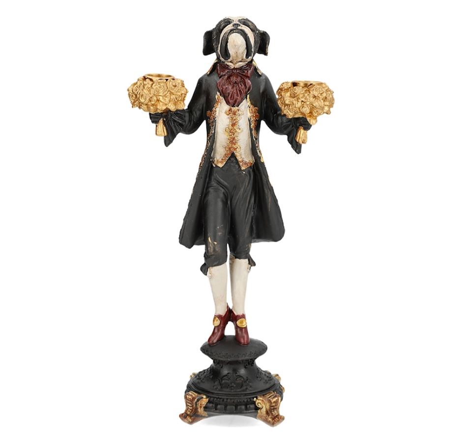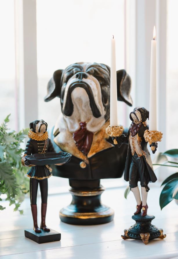 Bulldog, der holder to buketter i hænderne, hvor lysestagerne er.