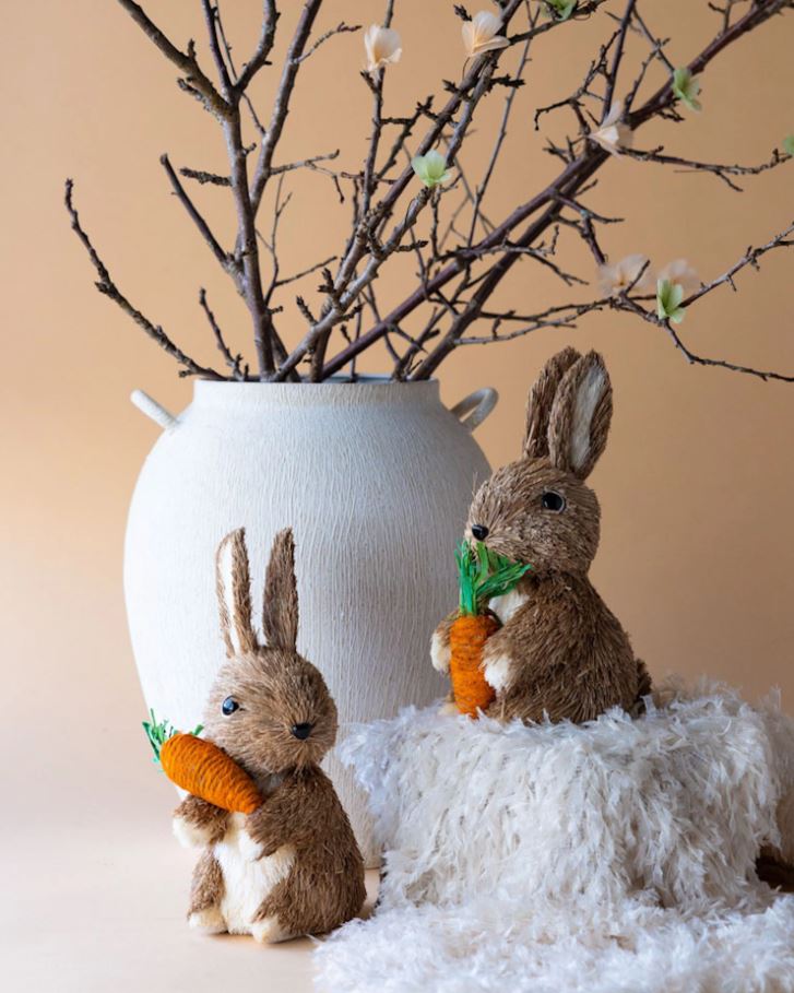 Disse søde kaniner, som hver holder en gulerod, bliver et legende indslag i indretningen. Perfekt som påskedekoration. Fremstillet i naturmaterialer.