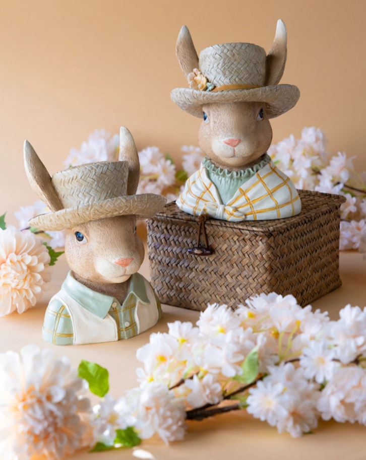 Byste med kanin iført hat. En sjov dekoration til hjemmet, som også passer til påske. Fremstillet i poly.