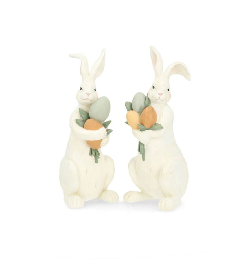 Pynt hjemmet til påsken med disse to kaniner, der holder en buket blomster. Fremstillet i poly.