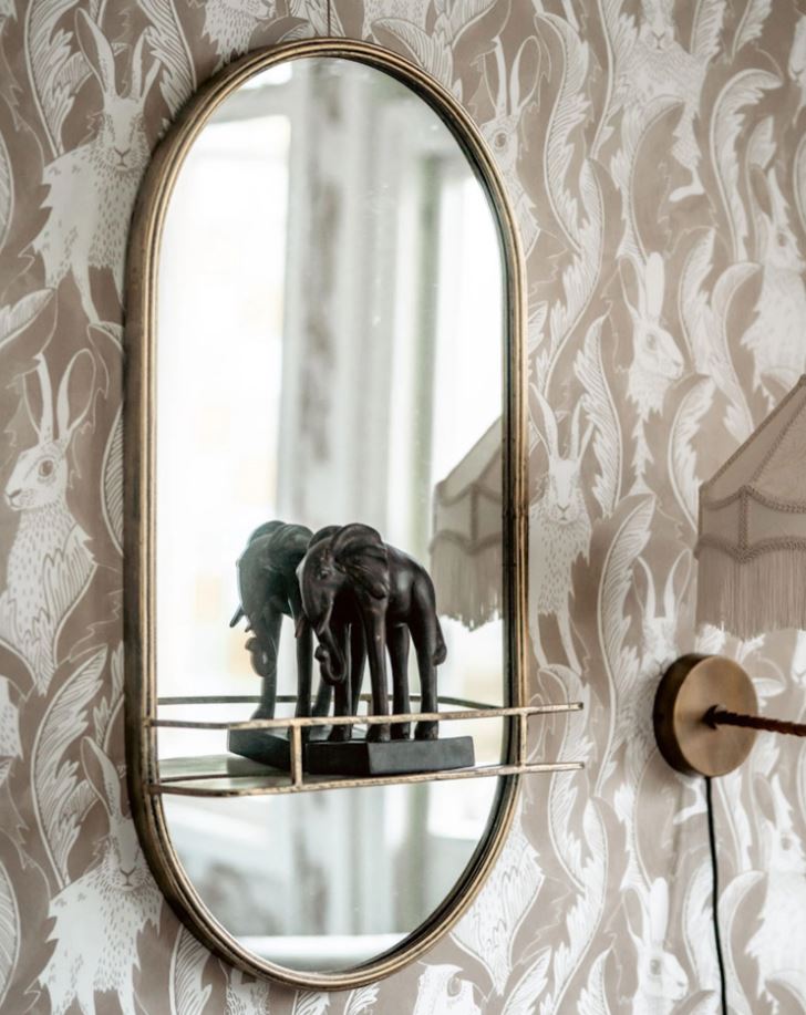 Fin spejl med en lille hylde. Perfekt til opbevaring af småting eller til at stille en lille vase med blomster. Fremstillet i metal og spejlglas.