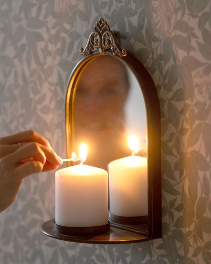 Smuk væglysestage med spejl bliver en perfekt blanding af dekoration og lysestage og hænger smukt på væggen. Fremstillet i spejlglas og metal.
